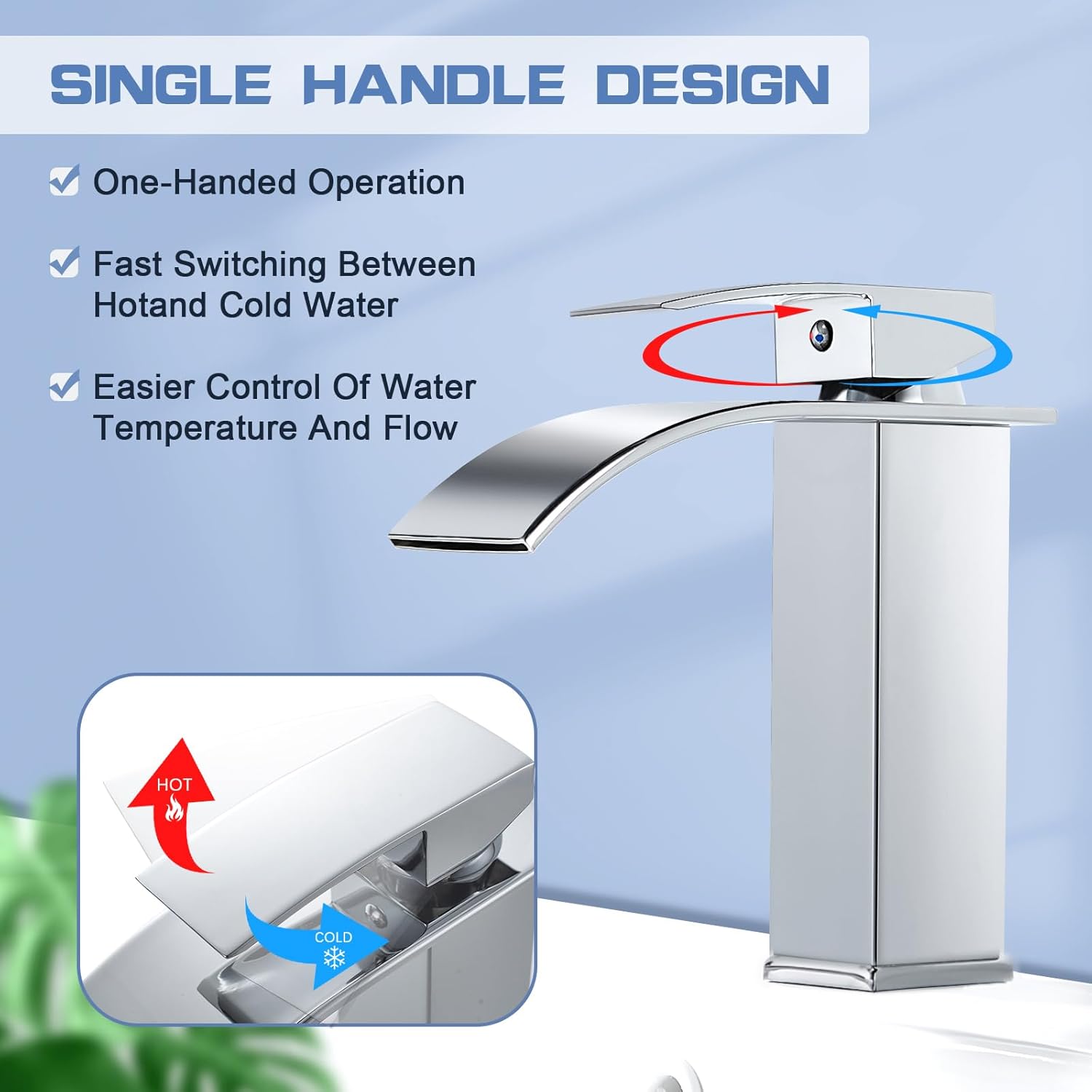 · ✦ HEALTHY: Waterfall bathroom sink taps are made of international standard H59 brass, with weighted average lead content <0.25%, which meets European standards, solid and durable, better protect your health. Advanced multi-layer chrome plating technology resists corrosion, just wipe with a soft cloth to keep it shiny.